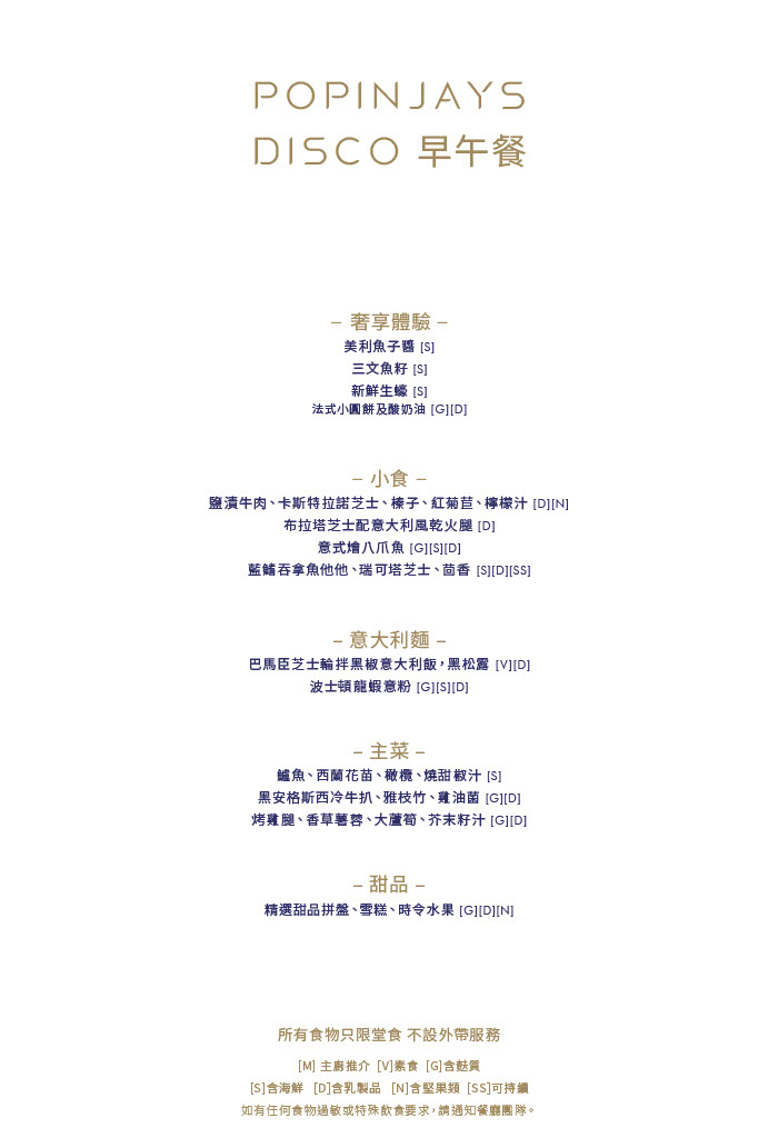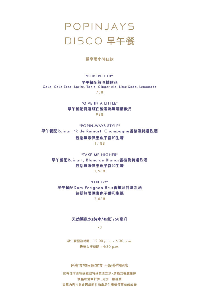 Popinjays 周末Disco早午餐 + "Take Me Higher" 無限暢飲Blanc de Blancs香檳及精選烈酒 +任食魚子醬和生蠔 -