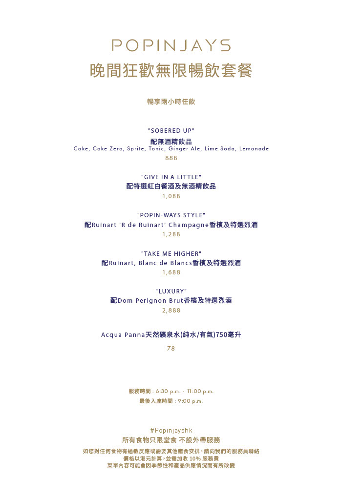 Popinjays 晚間狂歡早午餐 + "Give In A Little" 無限暢飲汽水及精選紅白酒 - 成人每位港幣1,088元